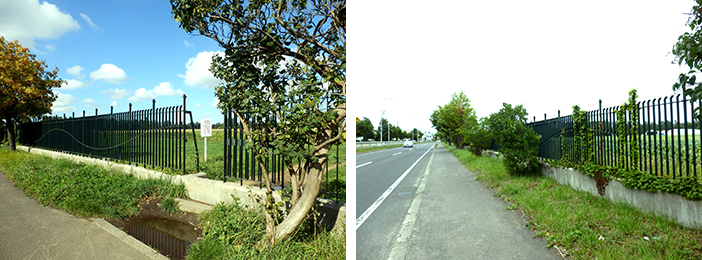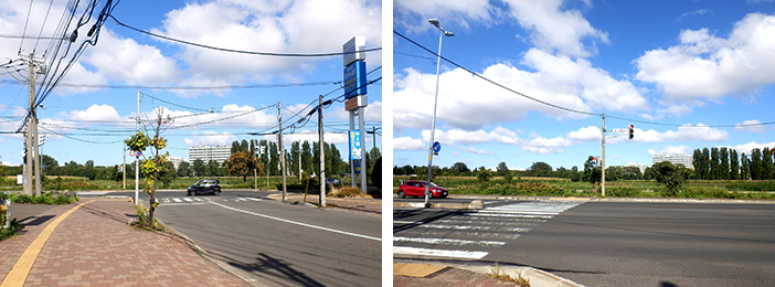 前方の横断歩道を渡ったら左方向に進みます。歩道脇のフェンスの向こうは北大農場です。
