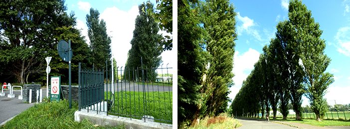 ステイメッツから道路に出ると左方向前方に北大農場・ポプラ並木が見えます。